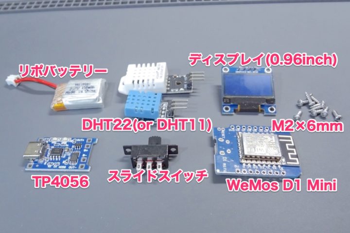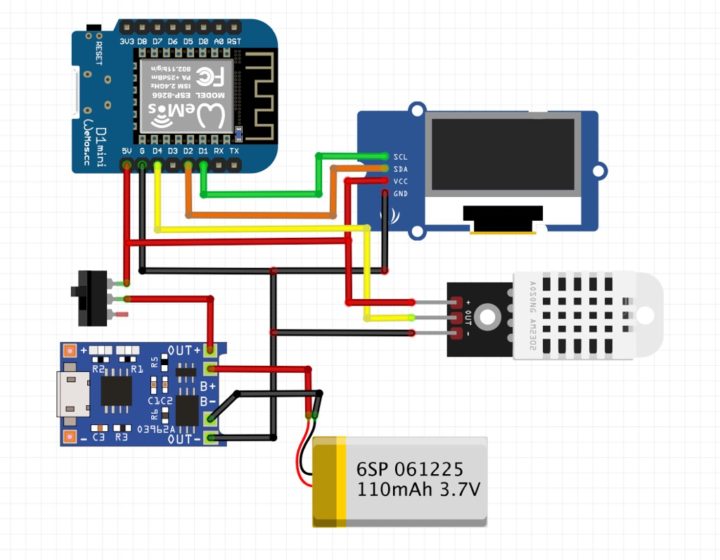 ブレッドボードでのテストのみの場合は、上記回路図のTP4056とリポバッテリーは省略しOLEDディスプレイとDHT22のVCC・GND端子をWeMos D1 Miniの5V端子・GND端子に接続してUSB端子からの給電で動かせば問題ありません。