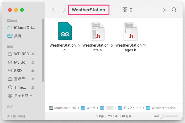 あとは通常通り[WeatherStation.ino]ファイルをクリックして開きます。