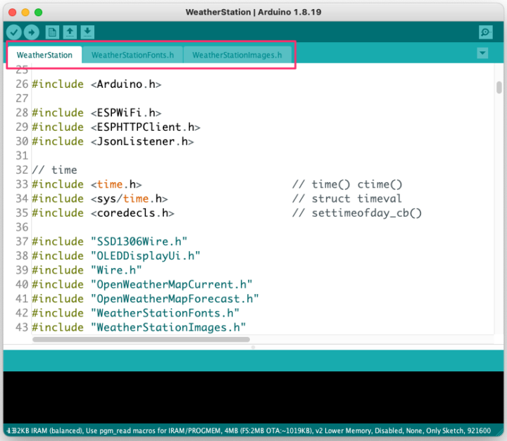 Arduino用のスケッチは、[WeatherStation.ino][WeatherStationFonts.h][WeatherStationImages.h]の3つのフィアルに分かれています。