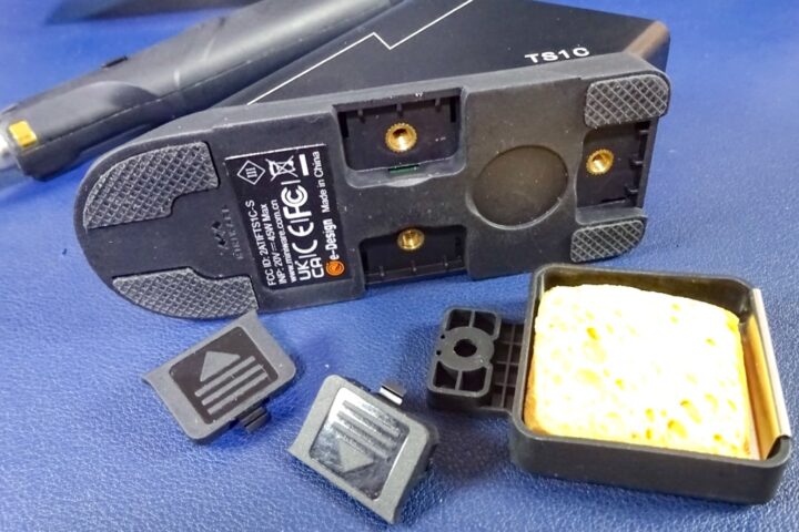 一般的にハンディータイプのこのような製品の電源にはリポバッテリーが使われることが多いのですが、TS1Cのコテ本体内には高容量のスーパーキャパシタが使われているようです。