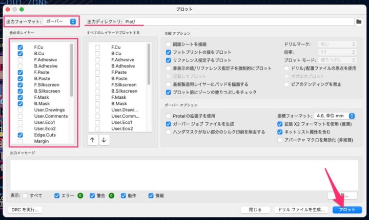 [出力フォーマット]は[ガーバー]を選択し、[出力ディレクトリ]を選びます。分かりやすいようにこちらでは[Plot]というフォルダを作り、ここにデータを出力するようにしました。