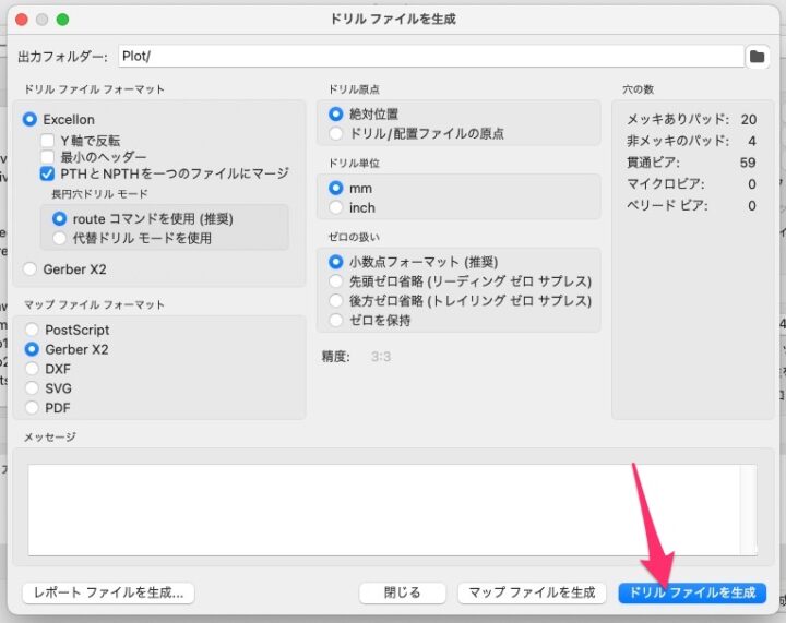 次に[ドリルファイルを生成]をクリックしてドリルファイルも出力しておきます。