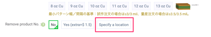基板設計時にシルクで[WayWayWay]とテキスト文字を入れ、発注項目の[Remove product No]で[Specify a location]を選択すれば無料で入る位置を指定することが出来ます。