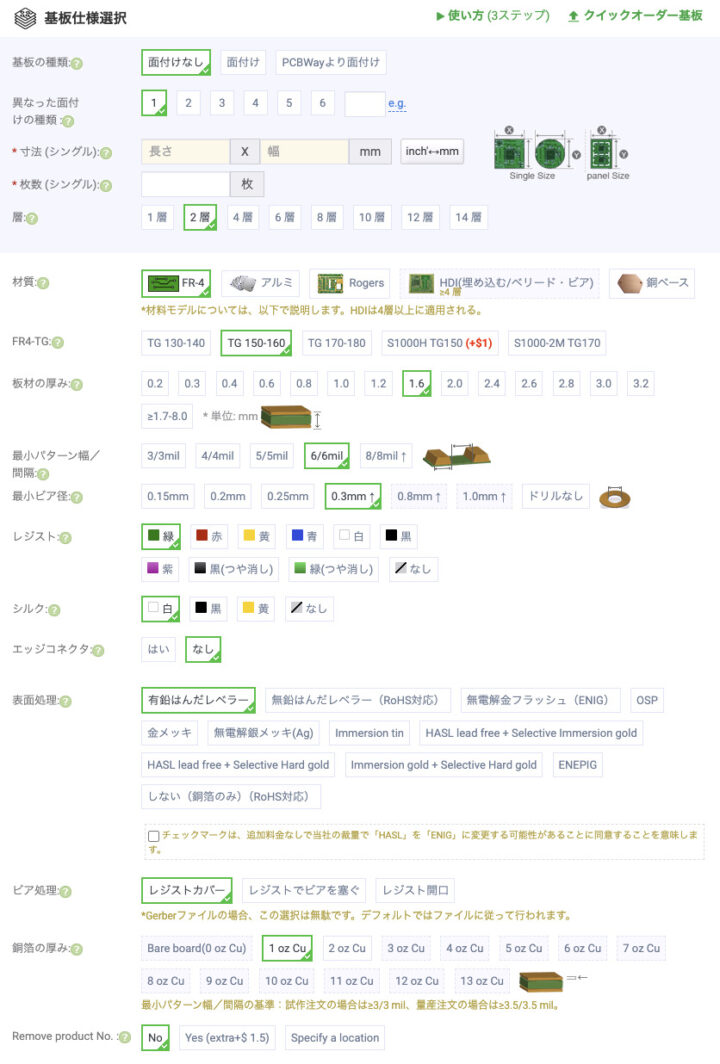 標準的な基板の発注であれば、他の項目はデフォルトで設定されている項目を選択しておけば問題ないと思います。