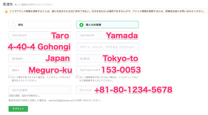 ここから基板データ(ガーバーファイル)のレビューや発注に進んでいくので、この時点で配送先住所も登録しておきました。