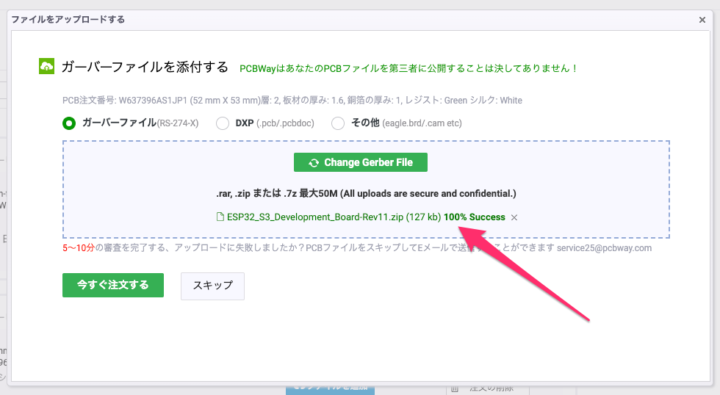 アップロードが完了したら[今すぐ注文する]をクリックするとPCBWayのエンジニアによるデータチェックが開始され不備等がないか、また発注に問題がなければ最終的な価格が決定されます。