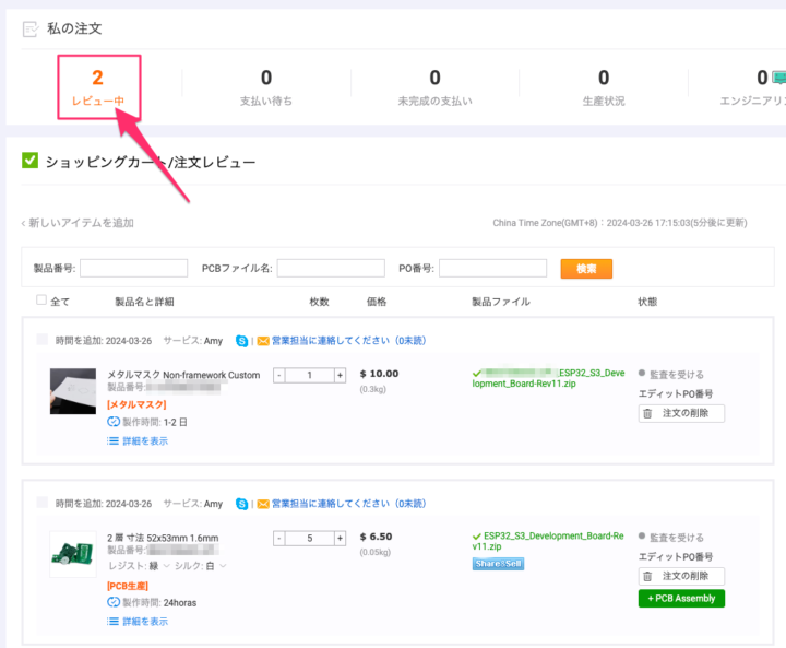 今回、基板とステンシルの発注なので[2レビュー中]と表示されています。