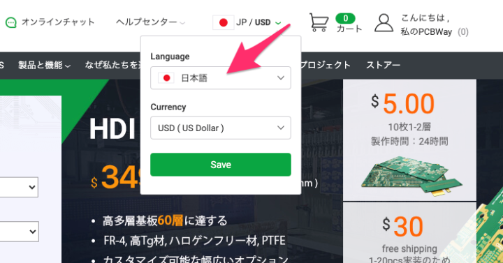 PCBWayトップページからまず概算の見積もりをするのですが、サイトは日本語にも対応しているのでこちらでは日本語表記にして説明を進めていきます。