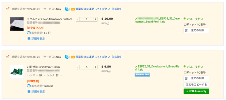 今回発注した2枚の基板ではテスト的に製品番号を削除するオプションやステンシルも一緒に発注したので料金はその分高くなっていますが、PCBWayでは基本1基板5ドルから製作を行うことができ配送も早く、そして発注時の思わぬ追加料金の発生なども事前にチェック出来るので、初めて自作基板を製作&発注される方にも分かりやすくていいと思います!
