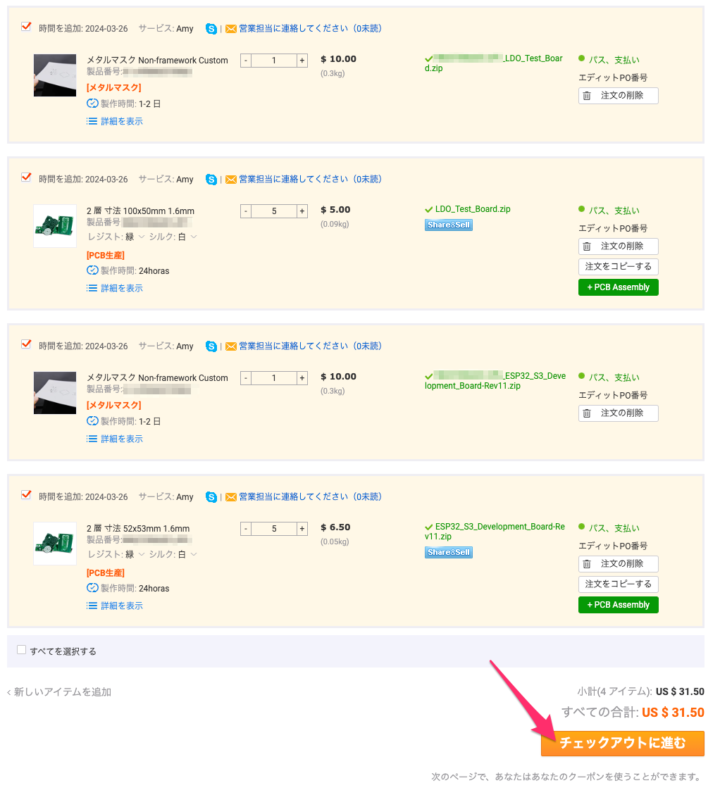 データのレビューが完了し基板データに問題がなく最終的な価格にも問題がなければ、[チェックアウトに進む]から発注へと進みます。