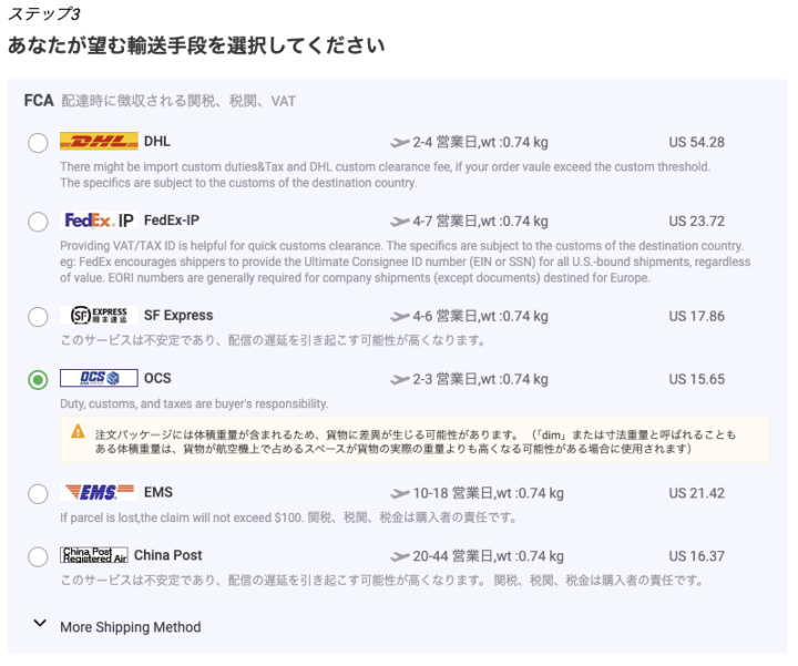 配送方法もDHLやFedEx、OCSといった多くの配送業者から選択することが出来ます。
