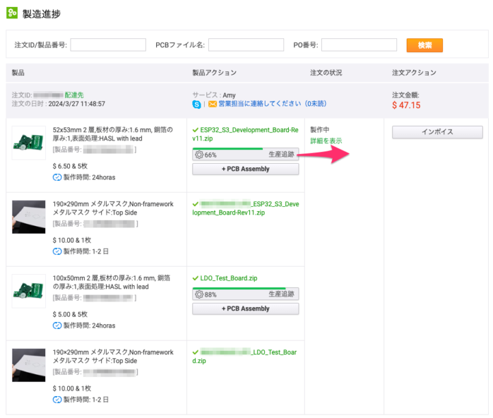 [詳細を見る]から各工程でどのような製造が行われているのかWebで見ることも出来るので、PCB製作では参考になると思います!今回の発注では、ほぼデフォルト項目を選択した2基板とともにステンシルも一緒に発注しました。