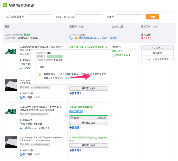 基板発注から2日で製造が完了しその当日に出荷、OCSで5日で手元に届きました。