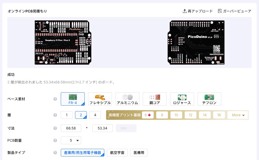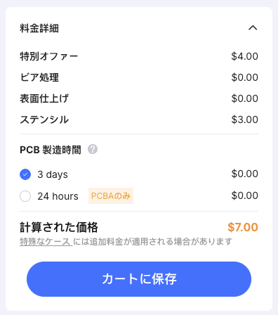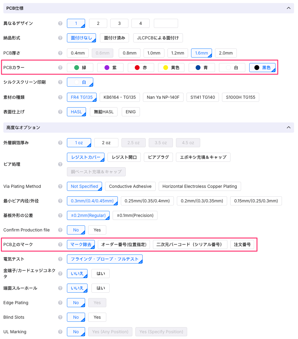 ガーバーファイルをサイトにアップロード後、製造項目を選択していきます。