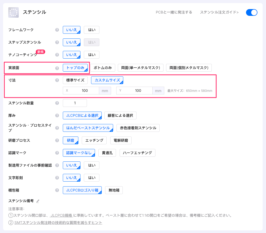 以上項目を選択し、JLCPCBに基板&ステンシルを発注しました。