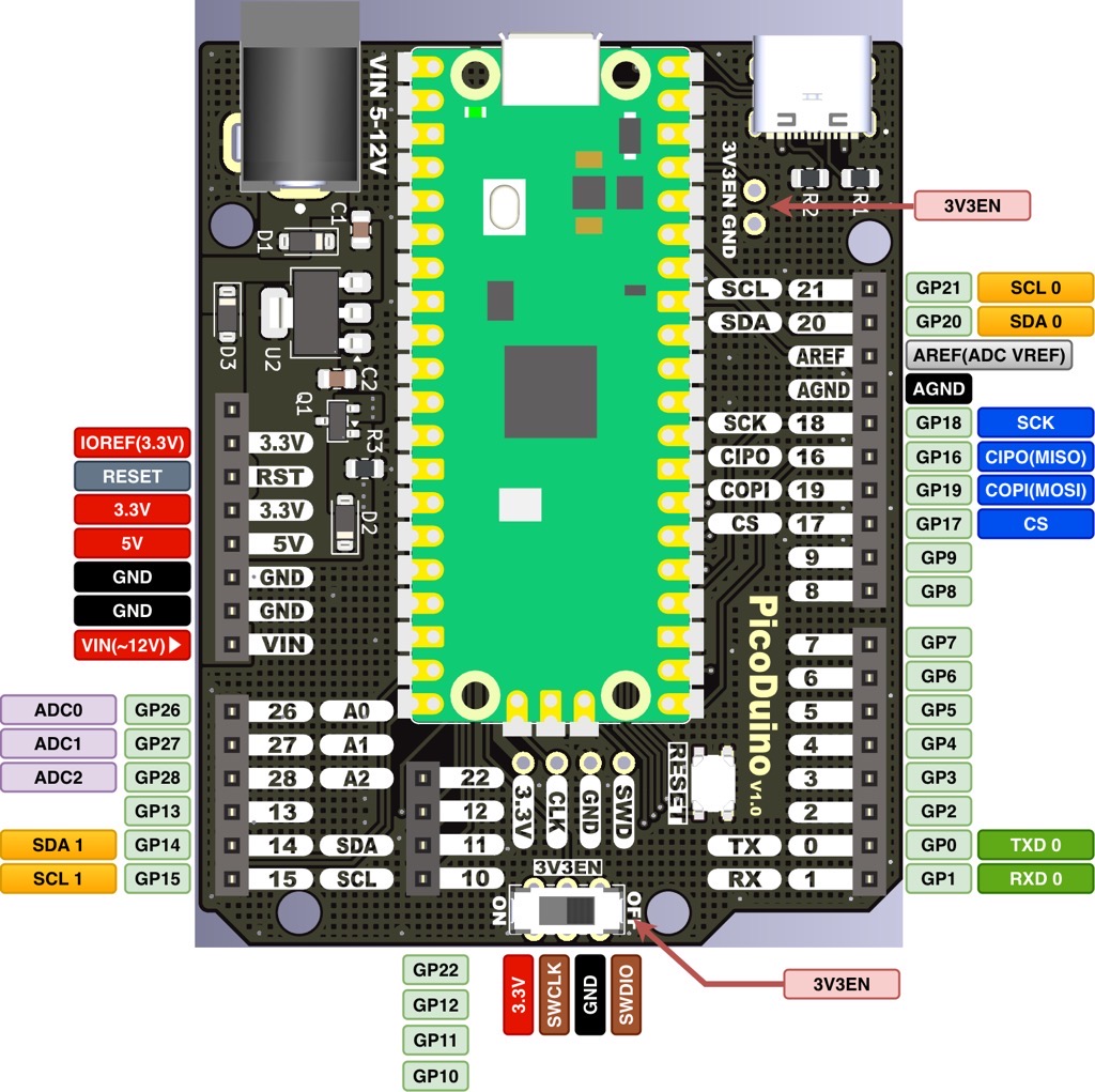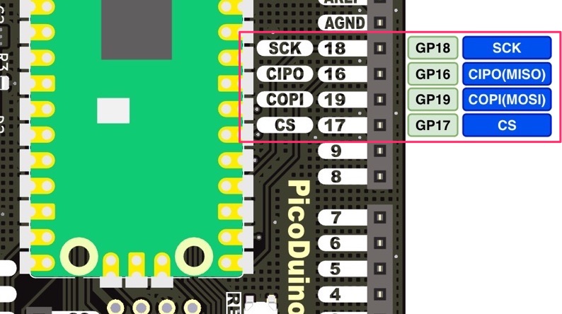 PicoのGPIOは非常に柔軟に使える一方で、SPIやI2C、UARTといった各種機能ピンの割り当てをArduino側の慣習に合わせようとすると、意外と制約が多くなります。