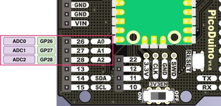 一方、RP2040(またはRP2350)では、GP26〜GP29の4本がADCピンとして用意されていますが、Picoでは内部的にGP29がVSYS電圧の監視に使用されているため、実際に使えるADCピンは3本のみとなります。