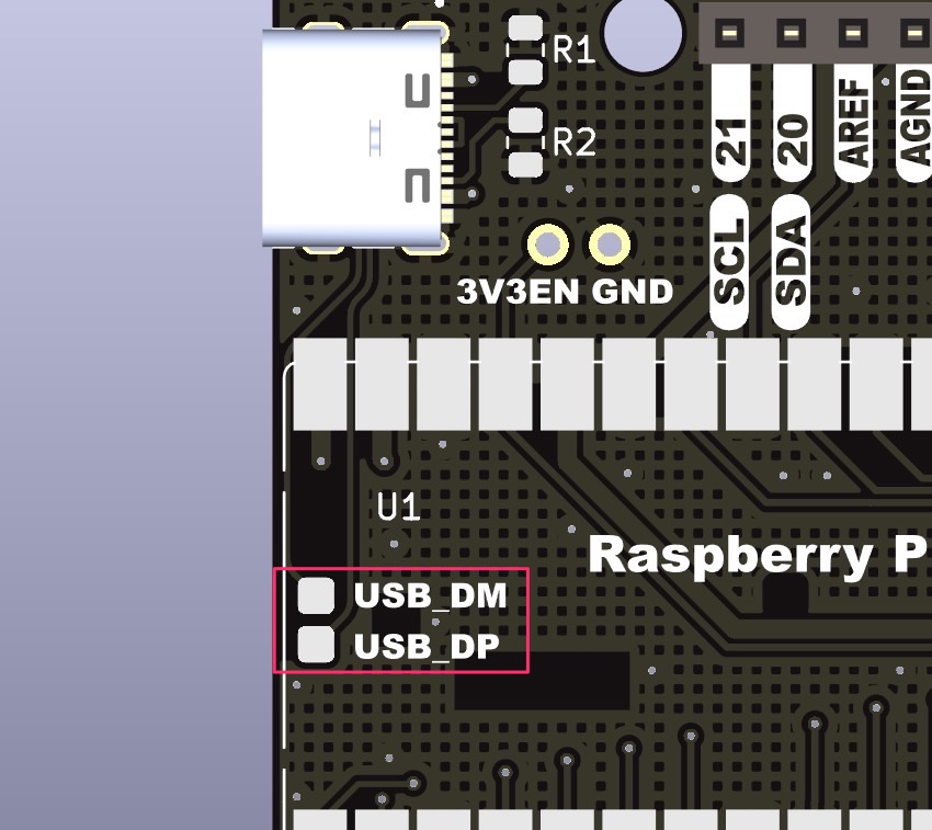 USBのデータライン(D+ / D−)については、Picoボード背面から引き出し、本ボード側のType-Cコネクタへ接続しています。