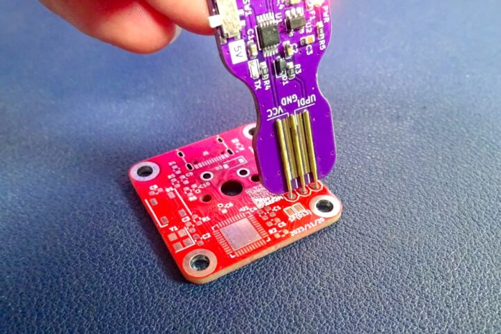 ポゴピンにはスプリングが入っていて基板に押し付けて使うわけですが、その際に持ちやすい基板形状&サイズ感で手元で電圧切替(5V or 3.3V)が出来るもの・・・