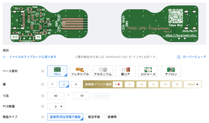今回製作したポゴピンUPDIプログラマの基板データ(ガーバーファイル)をダウンロード出来るようにしておきます。