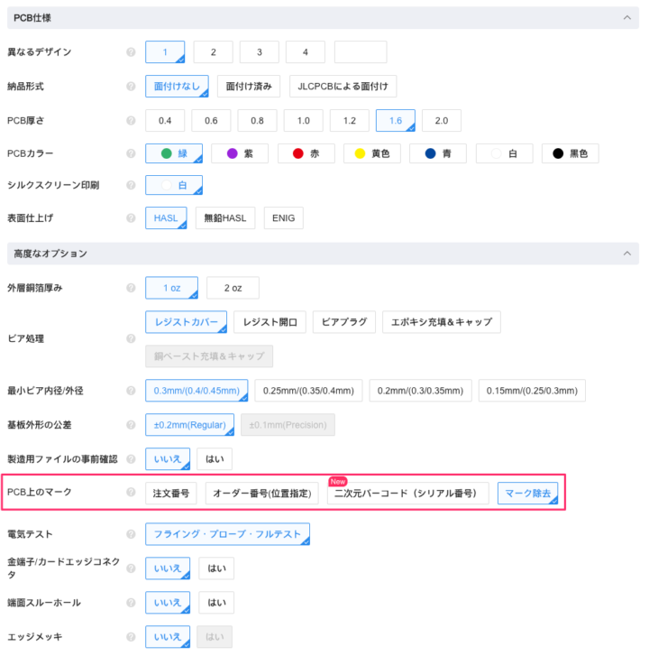 JLCPCBでは基板に入ってしまう製造番号を削除するオプションが現在無料となったので、[PCB上のマーク]は[マーク除去]を選択するのがいいと思います。