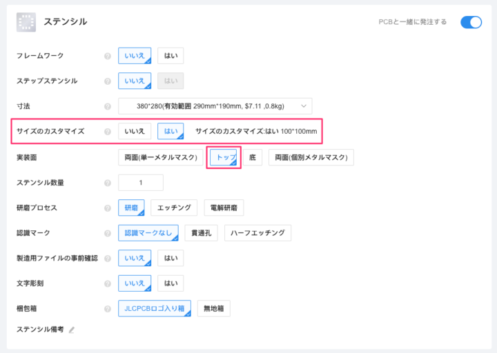JLCPCBのステンシル発注方法はこちらの記事でまとめています。
