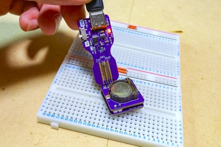 ブレッドボードに直接差し込んで書き込み等のテストが出来るようにコンパクトなボードとして仕上げました。