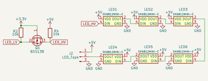 これでRP2040の3.3Vロジックの信号でLEDを制御すれば問題ないということになり、LEDの接続数が多い場合でもチラツキや動作が不安定になるといった不具合も起きないと思います。