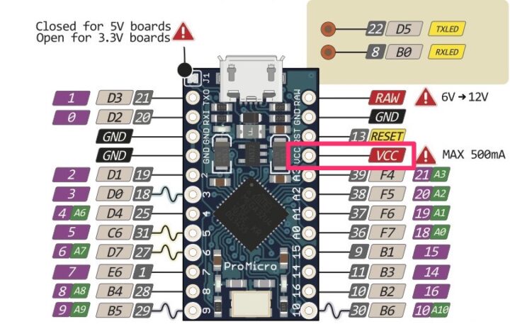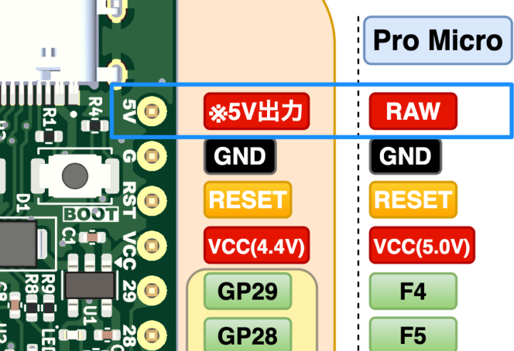 Pro Microと互換性を持たせた配置になっていますが、電源に関係する2つのピンがPro Microとは少し異なります。
