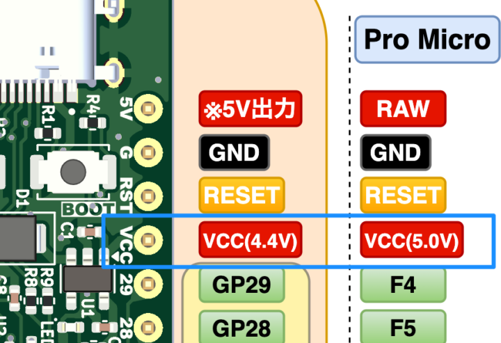 先述のようにPro MicroのVCC端子は5Vが出力されますが、本ボードでは4.4Vとしています。