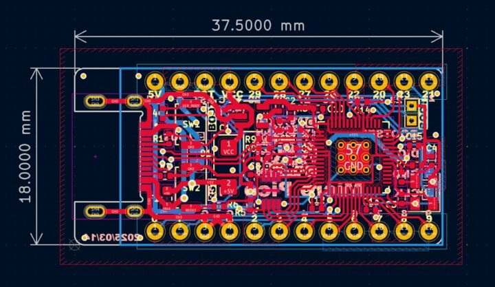 そのため、ピンヘッダーとUSB端子先端との位置関係から今回製作したボードでは37.5mm×18mmのボードサイズで製作することにしました。