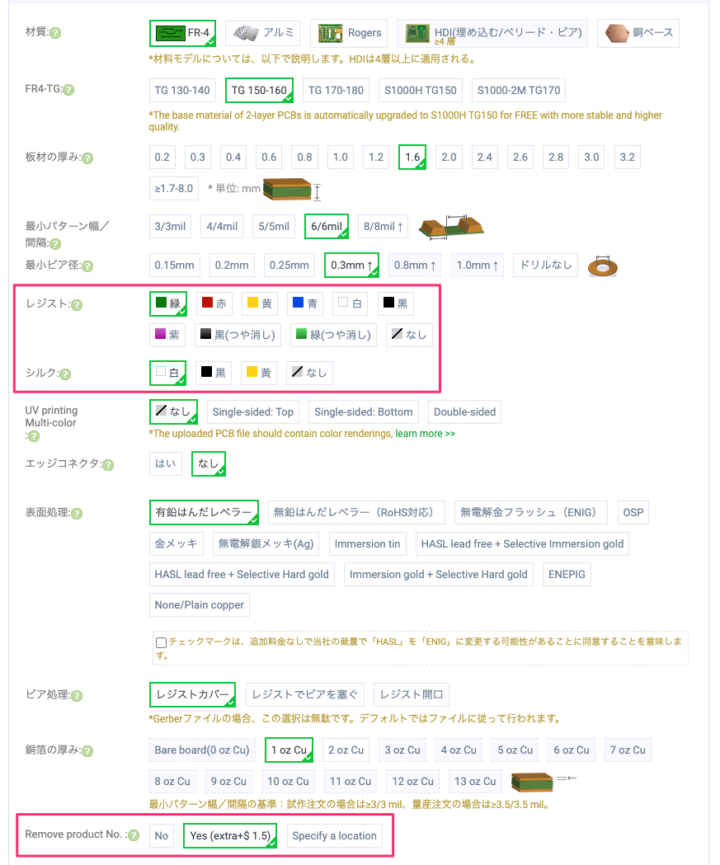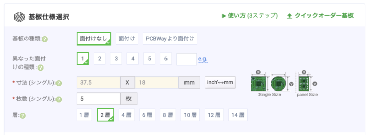 ガーバーファイルをPCBWayのサイトにアップロードし項目を選択していくのですが、本基板に関しては加工オプションなど特に選択する必要なくデフォルトで選択されている項目を選んでおけば製造することが出来ました。