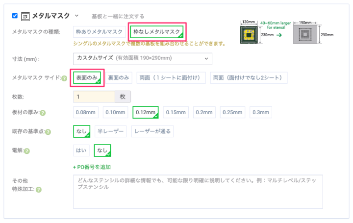 リフローやヒートガンを使いパーツを実装することを前提にメタルマスク(ステンシル)も発注しました。