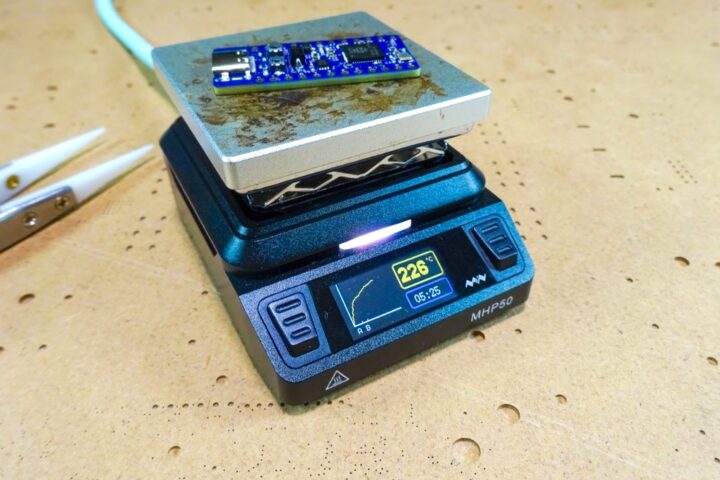 MHP50ではリフロープロファイルを使い予備加熱や保持時間などを設定してリフロー出来るのですが、今回使った0402といった小さなパーツでも立ち上がってしまう(マンハッタン現象)も起きにくいようで、実装は比較的楽に出来ました。