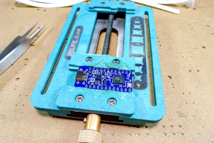 逆挿しで使用する場合にファームウェアの書き込みもしやすいように基板背面に[BOOTSEL]パッドを付けているので、ピンセット等を使い短絡させればファームウェアの書き込みも行えます。