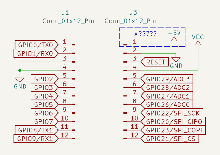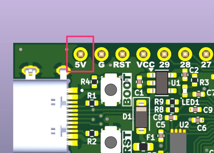 回路にダイオードを1本追加すればPro Micro同様に外部電源用のRAW端子として使うことも出来ますが、この端子を使う用途が考えられないので未使用端子とするか、無難に3.3Vや5V端子としておくか・・・ひとまず5V端子としています。