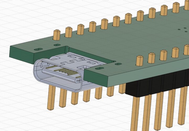 Type-C端子はPCB面から約3.5mmの高さがあるため逆挿しで基板に固定する場合、よく使われる一般的なピンヘッダーではハウジング部分の高さが2.5mmなので少し浮いた状態になってしまいます。