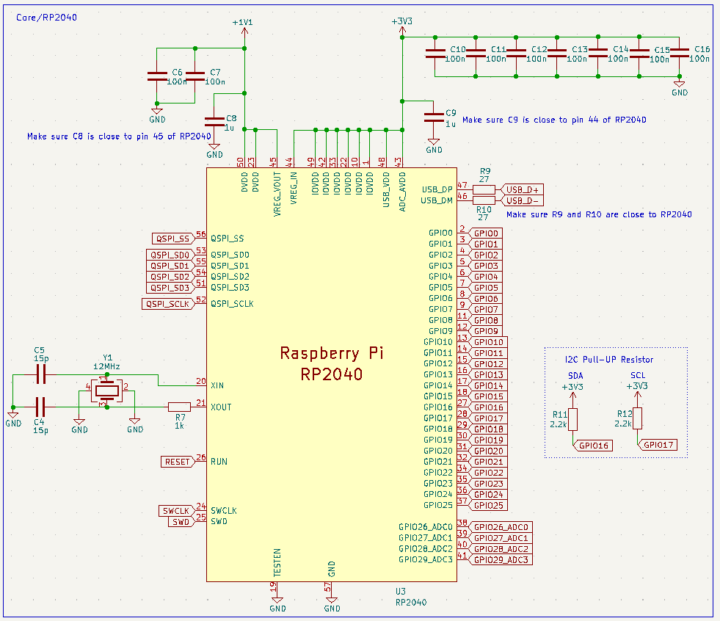 多くのバイパスコンデンサやUSBデータライン(D+ / D-)に接続されている抵抗など、なるべくRP2040チップの近くに配置するように指示されています。