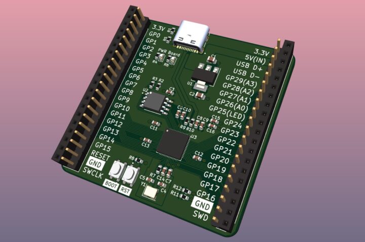 最小構成で組み全てのI/Oピンも引き出しているので、RP2040を使ったテスト回路を組む際に便利に使えそうです。