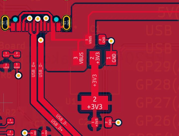 RP2040チップ周辺にはバイパスコンデンサなど比較的多くのパーツが使われているのですが、その配置や使われているパーツの定数なども参考になると思います。