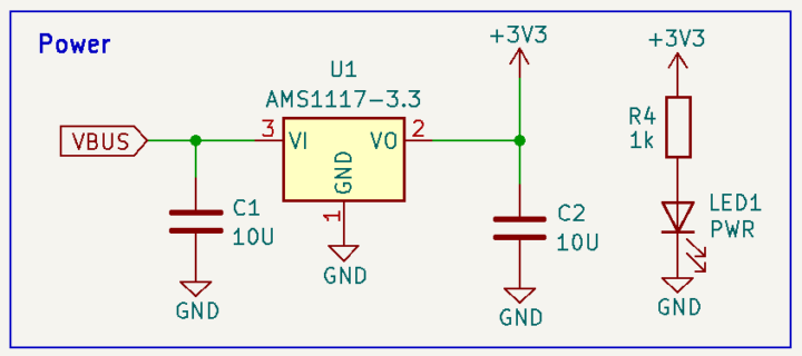 RP2040駆動電源となる3.3Vレギュレータチップは手持ちでたくさんあるAMS1117-3.3に変更しました。