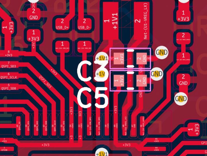 もう一度、公式さんが公開されているRP2350 Minimalの設計データを見直していたのですが、どうやら公式さんのデータではこの2つのコンデンサのフットプリント自体を微修正?されているようですね!