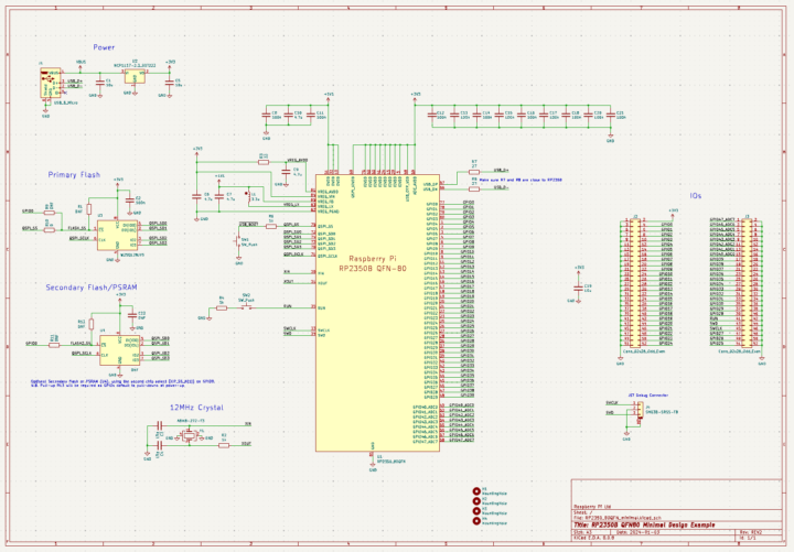 RP2350用に書かれた『ハードウェア設計ガイド』や『RP2350 Minimal』も公開されているので、RP2350を使い初めて基板設計する際は非常に参考になる資料なので一度目を通しておくのがいいかもしれません。