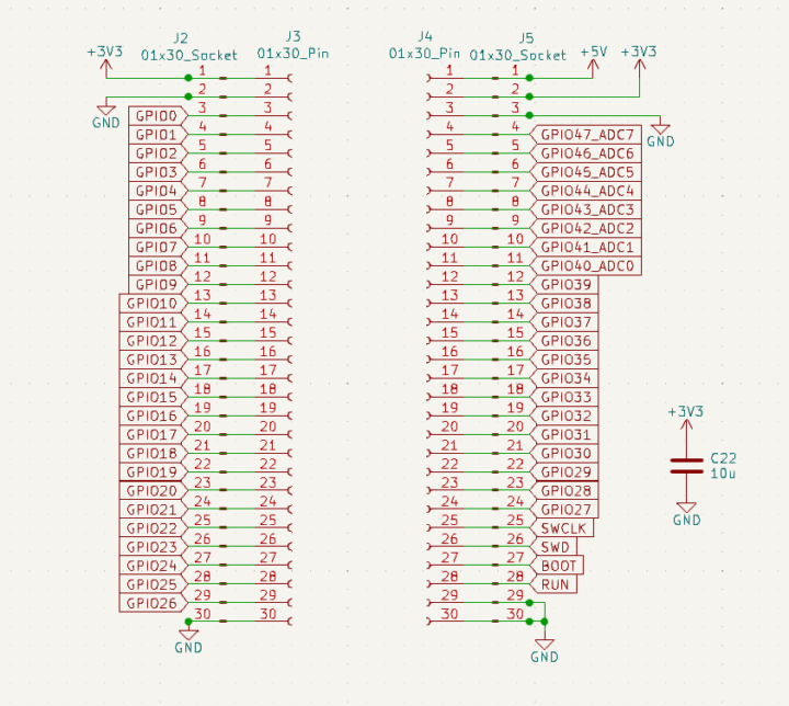 RP2350B(またはRP2354B)が動く最小構成で組んだボードなので、テスト等で使う場合ここから外部に組んだ多くのパーツや回路と接続して使うことが想定されます。