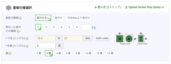 上記項目の選択が出来たら基板データ(ガーバーファイル)をアップロードしてレビュー&発注へと進みます。