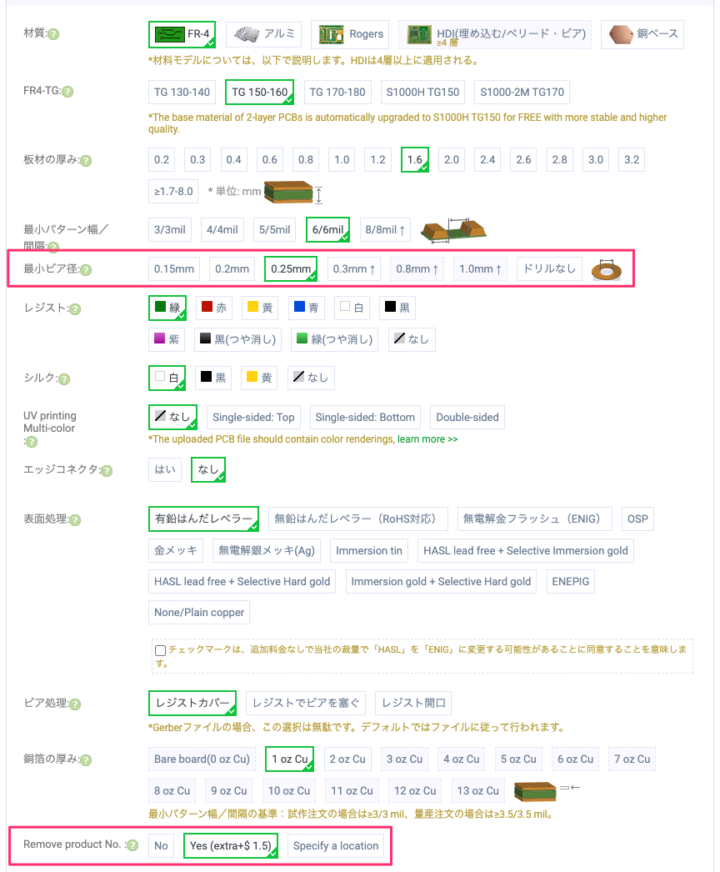 オプションとしては、基板製造時に入る製造番号[Remove product No.]を削除するオプション[Yes(extra+$1.5)]を選択しました。