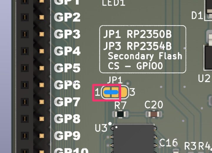 RP2350Bチップで使う場合、フラッシュが内蔵されていないのでジャンパーをこの位置(1)で短絡させておきます。