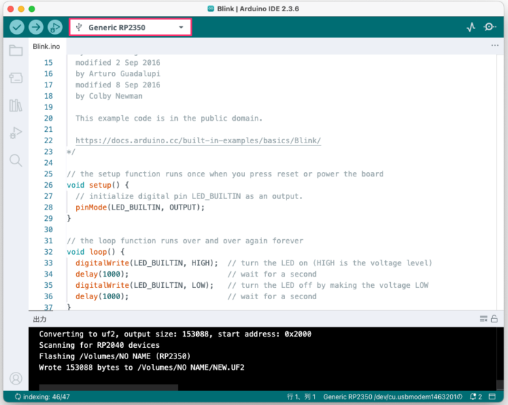 Arduino IDEの[ボード]に[Generic RP2350]を選択しLチカスケッチを書き込み・・・
