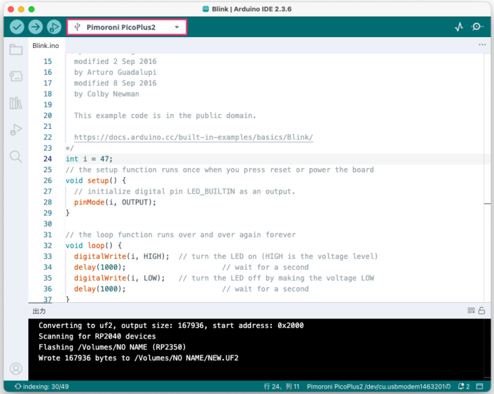 Aチップで使うこと前提なのかな?RP2350B搭載のボード『Pimoroni PicoPlus2』でとりあえず書き込んでみたらGP30-GP47も反応した!