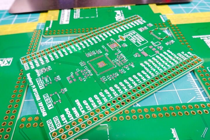 ENIGでは通常のHASL(有鉛はんだベラー)と比べるとパッド表面が平坦(均一)に仕上がるので、RP2350といったパッドのピッチが狭いICチップなどを扱う場合のリフローでブリッジやはんだ不良といったことが起きにくいので最近選択するようになりました!